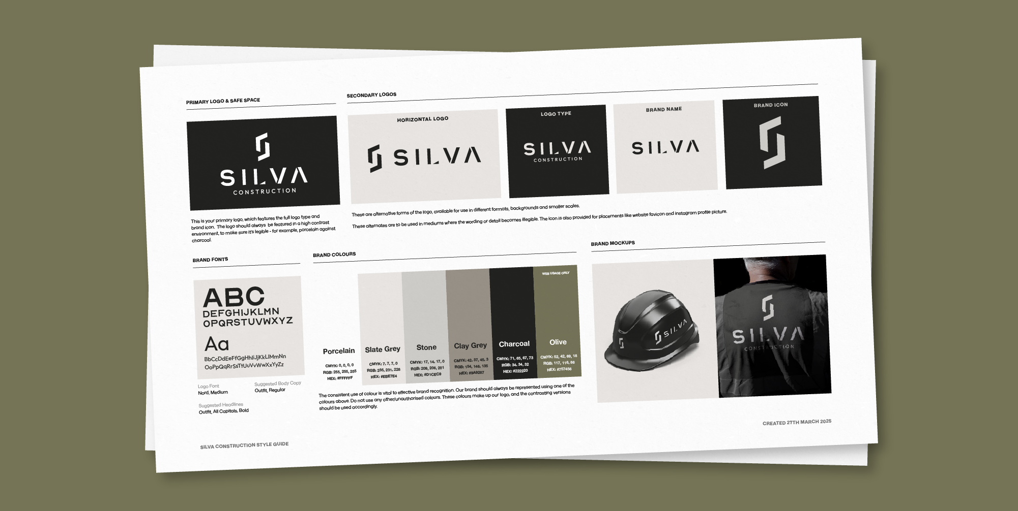 The colour palette blends deep olive with natural greys and charcoals, conveying trust, refinement, and craftsmanship while nodding subtly to materials and the construction environment. The green adds warmth and individuality, setting Silva apart in a sea of navy and gold corporate sameness.